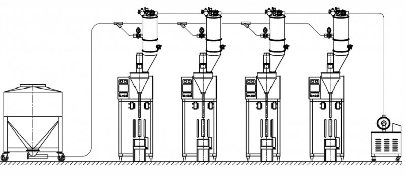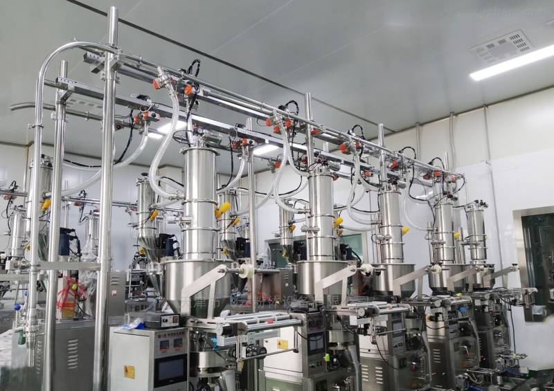 包装机中央供料系统由贮料仓、真空泵、若干个真空上料机料斗、管路系统、控制系统等组成,可完成由一个供料点向多台包装机集中供料,自动化程度高,无粉尘污染等优点,是制药厂、食品厂通过“GMP”认证,保持清洁、文明生产的设备。